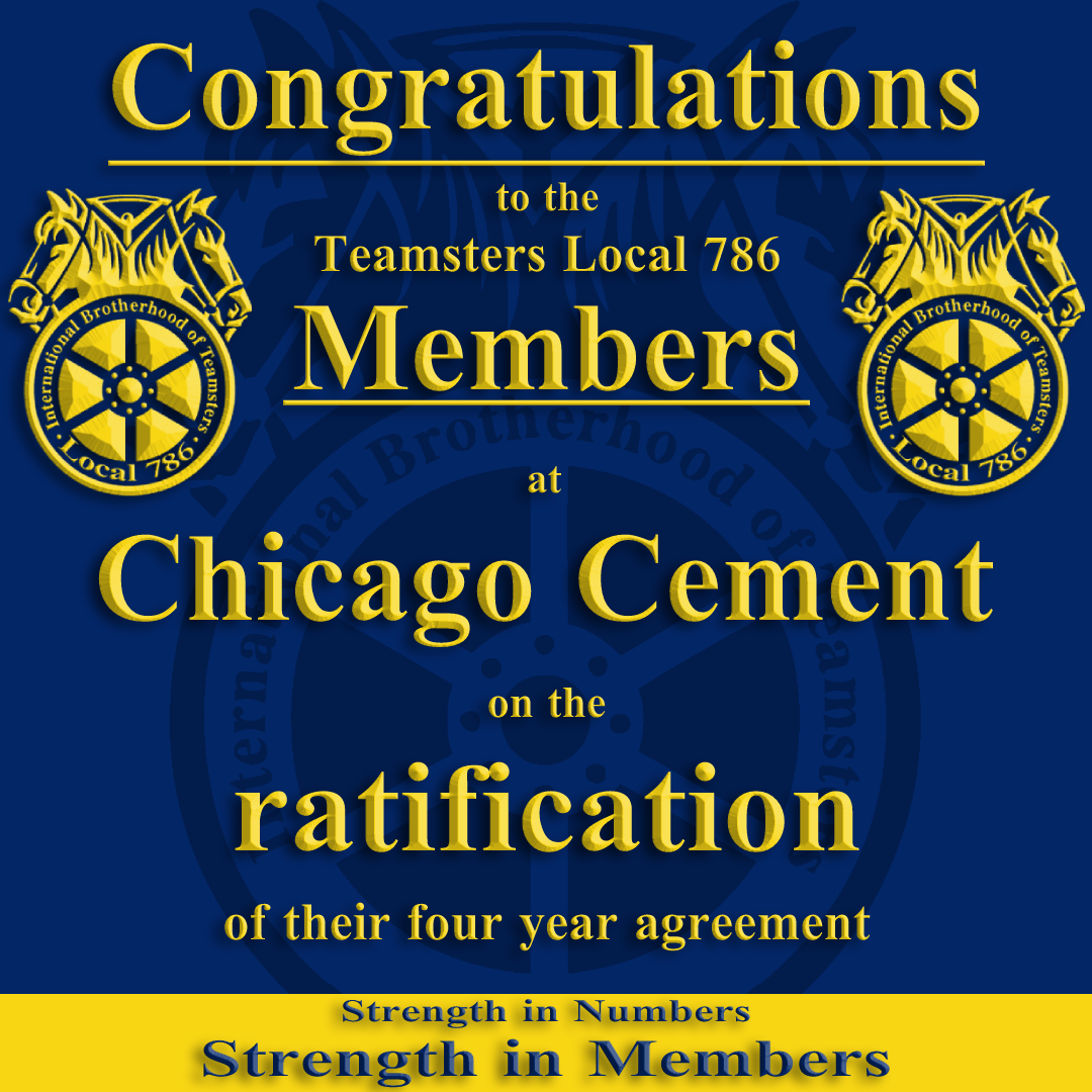 Congratulations to the Teamsters Local 786 members at Chicago Cement on the ratification of their four year agreement which significantly increases wages, benefits, and working conditions.